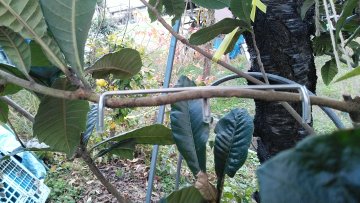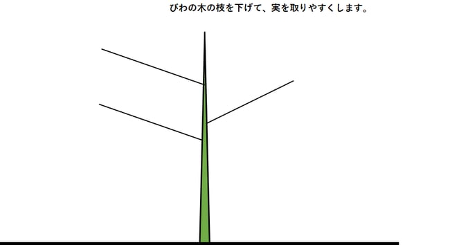 果樹の実を低い位置にて収穫する為に、果樹の枝を下側に曲げます。