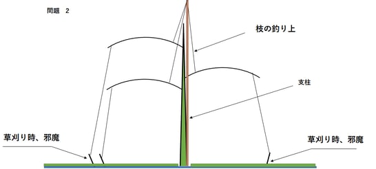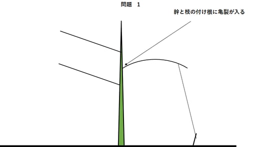 問題1、枝を下に引っ張ると、幹と枝の別れ目の所に亀裂(矢印部分)が入ります。